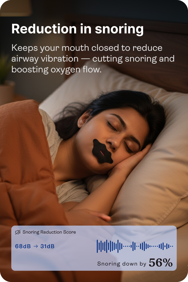 Mouth tape keeps your mouth closed, ensuring that you breathe through your nose rather than your mouth. Since mouth breathing can contribute to snoring, nasal breathing reduces throat vibrations, which means less snoring. Our mouth tape is perfect for anyone looking to reduce nighttime disturbances and sleep more soundly.