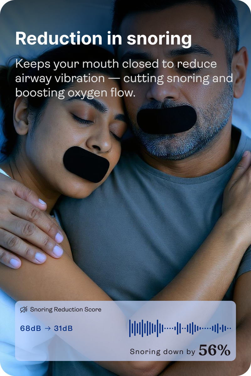 Mouth tape keeps your mouth closed, ensuring that you breathe through your nose rather than your mouth. Since mouth breathing can contribute to snoring, nasal breathing reduces throat vibrations, which means less snoring. Our mouth tape is perfect for anyone looking to reduce nighttime disturbances and sleep more soundly.
